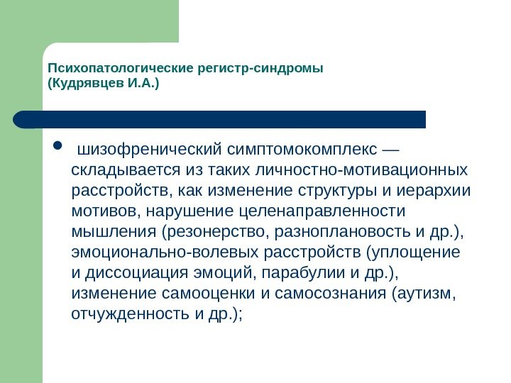 Психопатологические регистр-синдромы (Кудрявцев И. А. ) шизофренический симптомокомплекс — складывается из таких личностно-мотивационных расстройств, как изменение структуры и иерархии мотивов, нарушение целенаправленности мышления (резонерство, разноплановость и др. ), эмоционально-волевых расстройств (уплощение и диссоциация эмоций, парабулии и др. ), изменение самооценки и самосознания (аутизм, отчужденность и др. );
