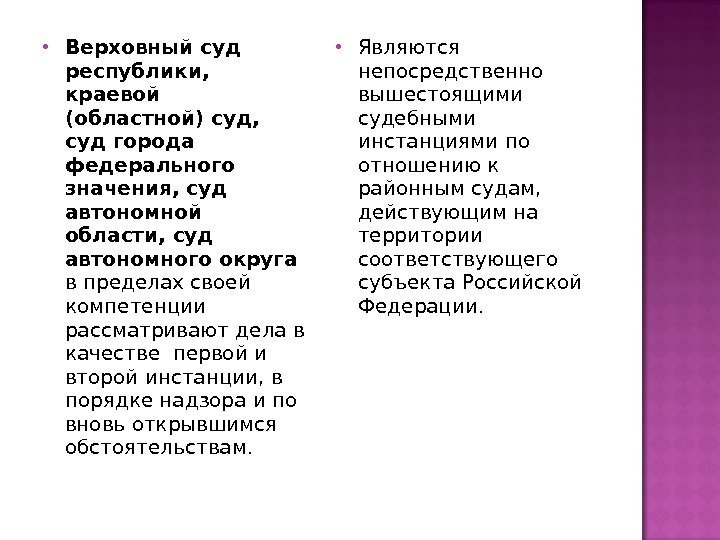 Верховный суд республики, краевой (областной) суд, суд города федерального значения, суд автономной области, суд автономного округа в пределах своей компетенции рассматривают дела в качестве первой и второй инстанции, в порядке надзора и по вновь открывшимся обстоятельствам. Являются непосредственно вышестоящими судебными инстанциями по отношению к районным судам, действующим на территории соответствующего субъекта Российской Федерации.