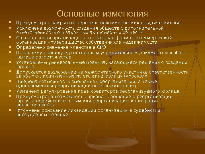 Основные изменения Предусмотрен закрытый перечень некоммерческих юридических лиц Исключена возможность создания обществ с дополнительной ответственностью и закрытых акционерных обществ Создана новая организационно-правовая форма некоммерческой организации — товарищество собственников недвижимости Определено значение членства в СРО По общему правилу единственным учредительным документом любого юрлица является устав Установлены универсальные правила, касающиеся решения о создании юрлица Допускается возложение на мажоритарного участника ответственности за убытки, причиненные по его вине юрлицу ( «прокол» Введена возможность смешанной реорганизации, а также одновременной реорганизации нескольких юрлиц Изменено регулирование прав кредиторов реорганизуемого юрлица Предусмотрена возможность признать решение о реорганизации юрлица недействительным или реорганизацию корпорации несостоявшейся Уточнены основания ликвидации организации в судебном и внесудебном порядке