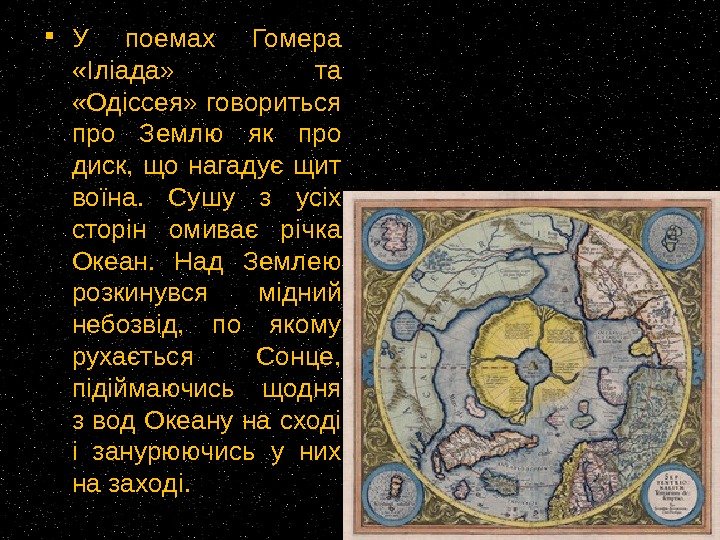 У поемах Гомера «Іліада» та «Одіссея» говориться про Землю як про диск, що нагадує щит воїна. Сушу з усіх сторін омиває річка Океан. Над Землею розкинувся мідний небозвід, по якому рухається Сонце, підіймаючись щодня з вод Океану на сході і занурюючись у них на заході.