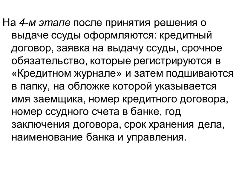 На 4-м этапе после принятия решения о выдаче ссуды оформляются: кредитный договор, заявка на выдачу ссуды, срочное обязательство, которые регистрируются в «Кредитном журнале» и затем подшиваются в папку, на обложке которой указывается имя заемщика, номер кредитного договора, номер ссудного счета в банке, год заключения договора, срок хранения дела, наименование банка и управления.