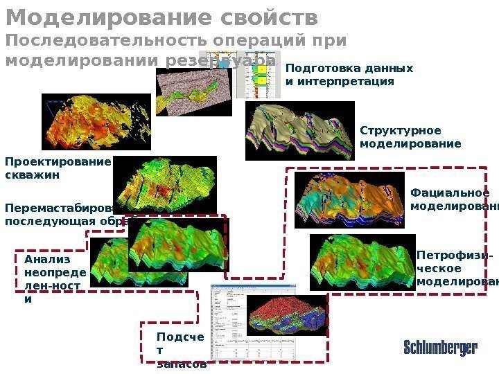 Подсче т запасов Подготовка данных и интерпретация Структурное моделирование Перемастабирование и последующая обработка. Проектирование скважин Анализ неопреде лен-ност и Петрофизи- ческое моделирование. Фациальное моделирование. Моделирование свойств Последовательность операций при моделировании резервуара