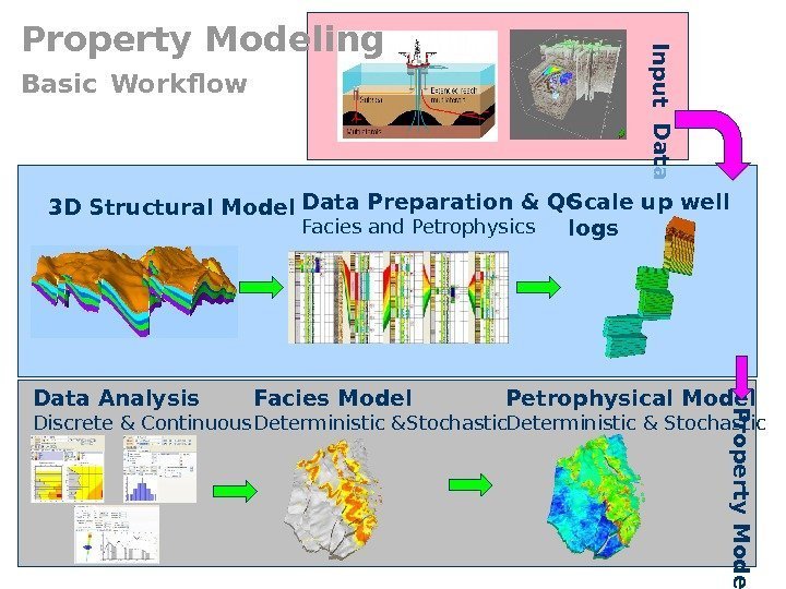 Property Modeling Basic Workflow. In p u t D a ta Facies Model Deterministic &Stochastic. Data Analysis Discrete & Continuous P ro p e rty M o d e lin g Petrophysical Model Deterministic & Stochastic. Data Preparation & QC Facies and Petrophysics 3 D Structural Model Scale up well logs