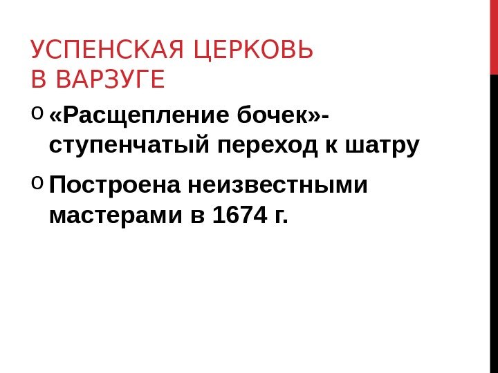 УСПЕНСКАЯ ЦЕРКОВЬ В ВАРЗУГЕ o «Расщепление бочек» — ступенчатый переход к шатру o Построена неизвестными мастерами в 1674 г.