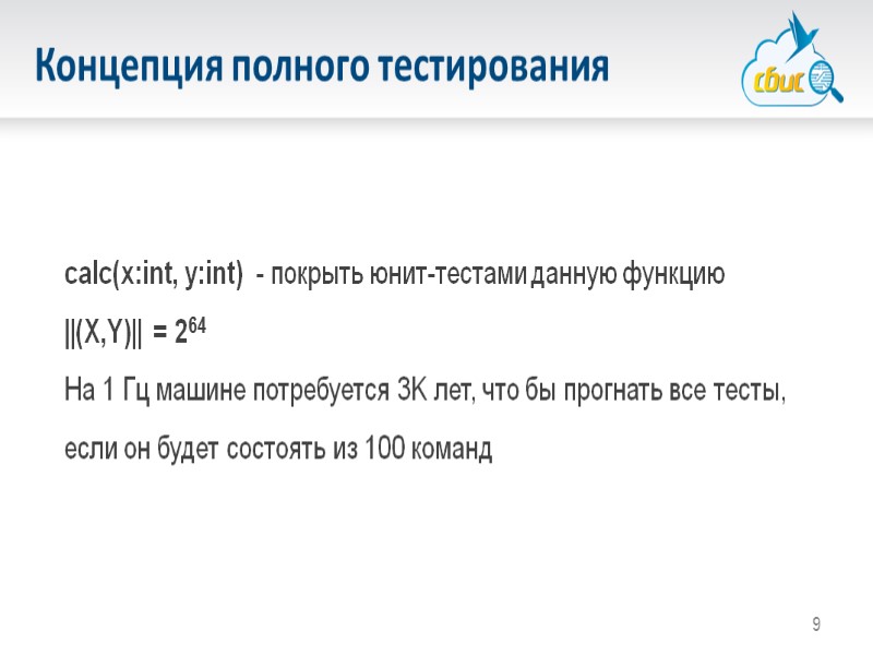 9 Концепция полного тестирования calc(x:int, y:int) - покрыть юнит-тестами данную функцию ||(X,Y)|| = 264 На 1 Гц машине потребуется 3K лет, что бы прогнать все тесты, если он будет состоять из 100 команд