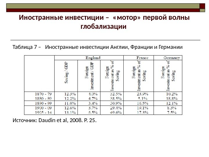 Иностранные инвестиции – «мотор» первой волны глобализации Таблица 7 – Иностранные инвестиции Англии, Франции и Германии Источник: Daudin et al, 2008. P. 25.