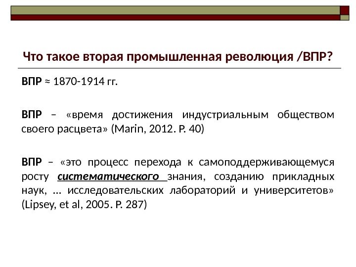 Что такое вторая промышленная революция /ВПР? ВПР ≈ 1870 -1914 гг. ВПР – «время достижения индустриальным обществом своего расцвета» (Marin, 2012. P. 40) ВПР – «это процесс перехода к самоподдерживающемуся росту систематического знания, созданию прикладных наук, … исследовательских лабораторий и университетов» (Lipsey, et al, 2005. P. 287)