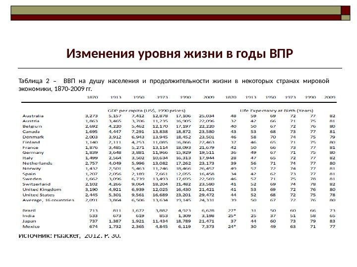 Таблица 2 – ВВП на душу населения и продолжительности жизни в некоторых странах мировой экономики, 1870 -2009 гг. Источник: Haacker, 2012. P. 30. Изменения уровня жизни в годы ВПР