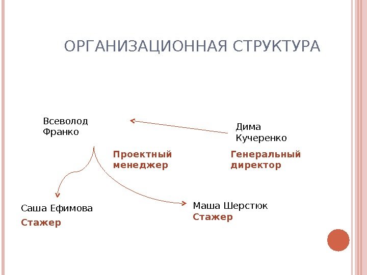 ОРГАНИЗАЦИОННАЯ СТРУКТУРА Генеральный директор. Проектный менеджер Дима Кучеренко. Всеволод Франко Саша Ефимова Маша Шерстюк Стажер
