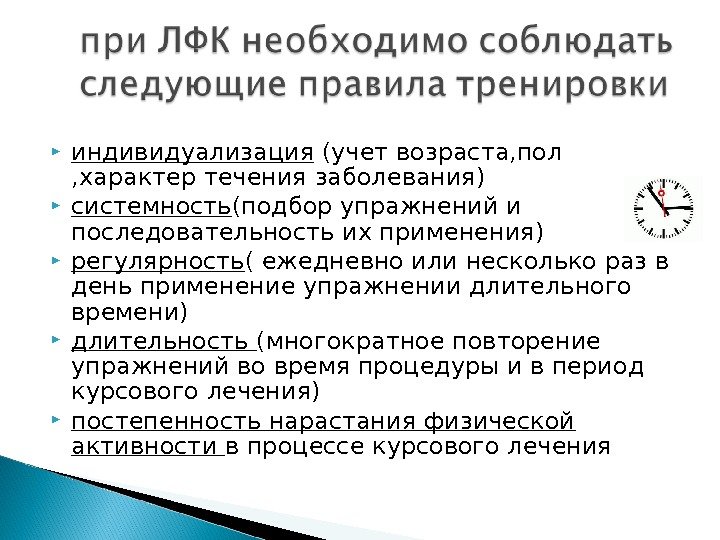 индивидуализация (учет возраста, пол , характер течения заболевания) системность (подбор упражнений и последовательность их применения) регулярность ( ежедневно или несколько раз в день применение упражнении длительного времени) длительность (многократное повторение упражнений во время процедуры и в период курсового лечения) постепенность нарастания физической активности в процессе курсового лечения