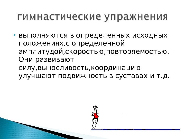 выполняются в определенных исходных положениях, с определенной амплитудой, скоростью, повторяемостью. Они развивают силу, выносливость, координацию улучшают подвижность в суставах и т. д.