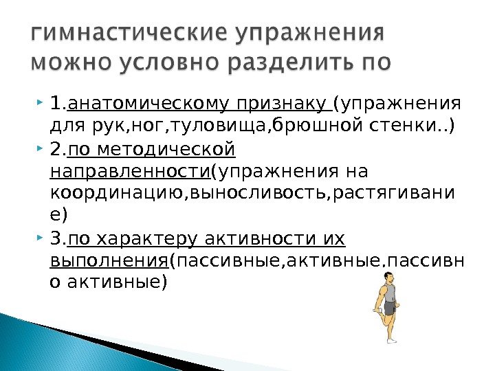 1. анатомическому признаку (упражнения для рук, ног, туловища, брюшной стенки. . ) 2. по методической направленности (упражнения на координацию, выносливость, растягивани е) 3. по характеру активности их выполнения (пассивные, активные, пассивн о активные)