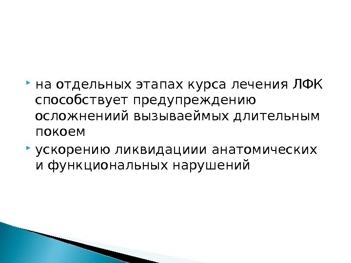 на отдельных этапах курса лечения ЛФК способствует предупреждению осложнениий вызываеймых длительным покоем ускорению ликвидациии анатомических и функциональных нарушений