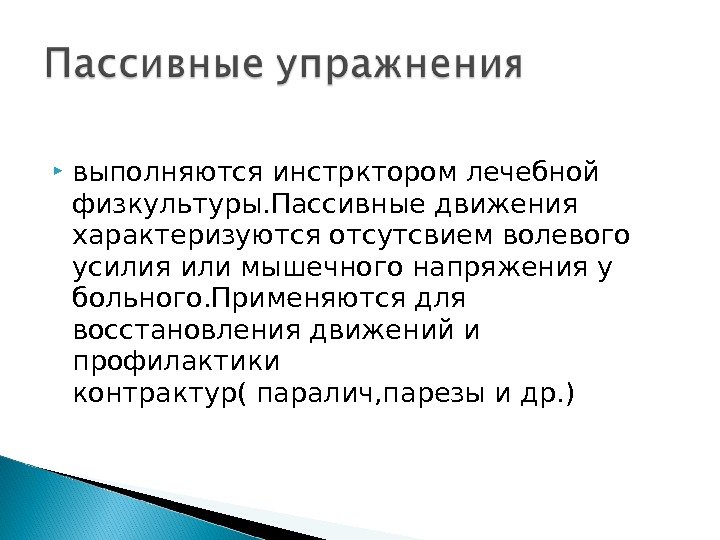 выполняются инстрктором лечебной физкультуры. Пассивные движения характеризуются отсутсвием волевого усилия или мышечного напряжения у больного. Применяются для восстановления движений и профилактики контрактур( паралич, парезы и др. )