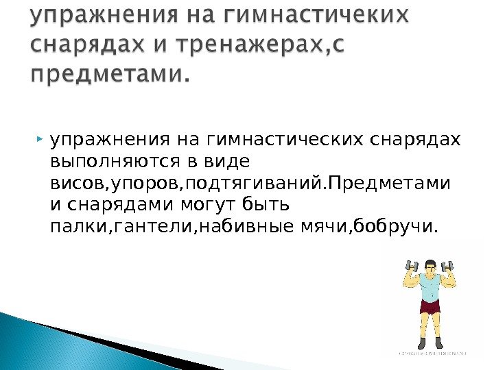 упражнения на гимнастических снарядах выполняются в виде висов, упоров, подтягиваний. Предметами и снарядами могут быть палки, гантели, набивные мячи, бобручи.