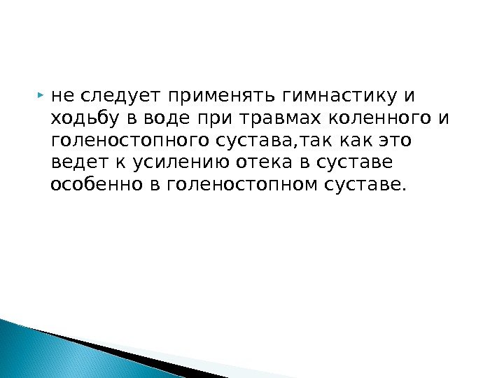не следует применять гимнастику и ходьбу в воде при травмах коленного и голеностопного сустава, так как это ведет к усилению отека в суставе особенно в голеностопном суставе.