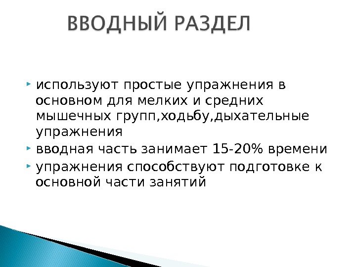 используют простые упражнения в основном для мелких и средних мышечных групп, ходьбу, дыхательные упражнения вводная часть занимает 15 -20% времени упражнения способствуют подготовке к основной части занятий