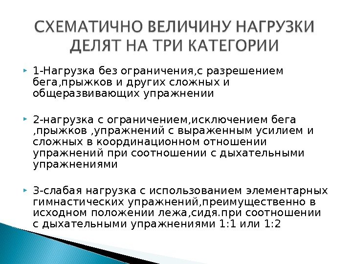 1 -Нагрузка без ограничения, с разрешением бега, прыжков и других сложных и общеразвивающих упражнении 2 -нагрузка с ограничением, исключением бега , прыжков , упражнений с выраженным усилием и сложных в координационном отношении упражнений при соотношении с дыхательными упражнениями 3 -слабая нагрузка с использованием элементарных гимнастических упражнений, преимущественно в исходном положении лежа, сидя. при соотношении с дыхательными упражнениями 1: 1 или 1: