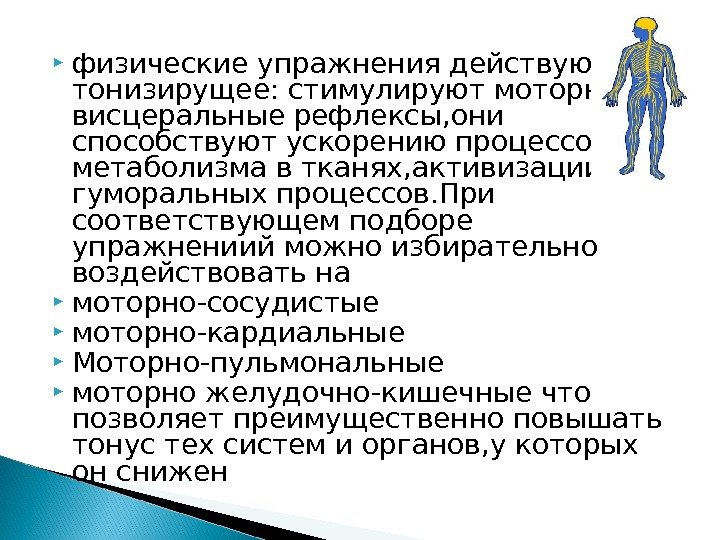 физические упражнения действуют тонизирущее: стимулируют моторно висцеральные рефлексы, они способствуют ускорению процессов метаболизма в тканях, активизации гуморальных процессов. При соответствующем подборе упражнениий можно избирательно воздействовать на моторно-сосудистые моторно-кардиальные Моторно-пульмональные моторно желудочно-кишечные что позволяет преимущественно повышать тонус тех систем и органов, у которых он снижен