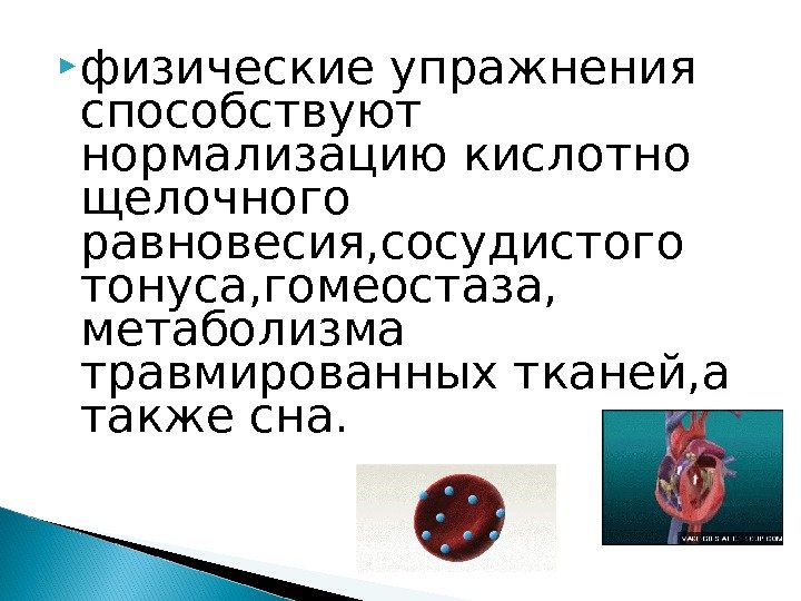 физические упражнения способствуют нормализацию кислотно щелочного равновесия, сосудистого тонуса, гомеостаза, метаболизма травмированных тканей, а также сна.