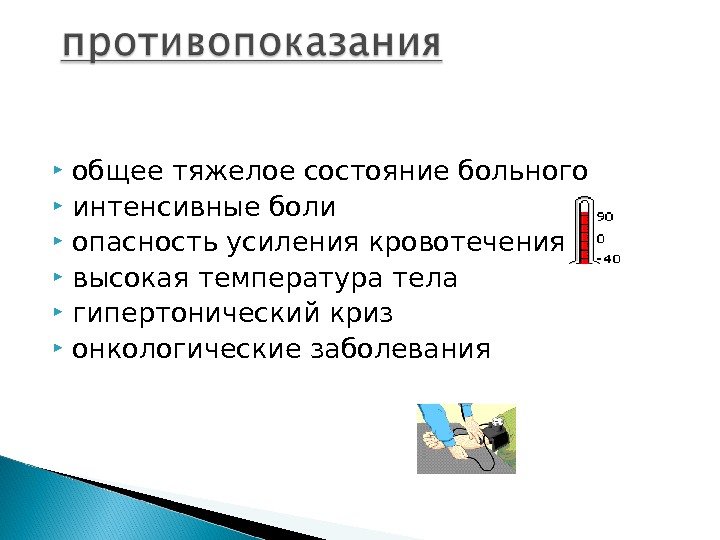 общее тяжелое состояние больного интенсивные боли опасность усиления кровотечения высокая температура тела гипертонический криз онкологические заболевания