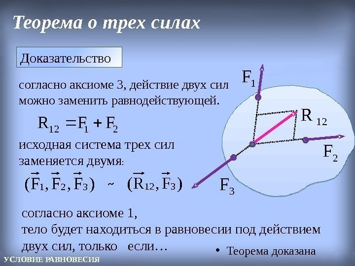 Теорема о трех силах 2112 FFR )F, F, F(321 )F, R(312~Доказательство 1 F 2 F 12 R 3 F согласно аксиоме 3, действие двух сил можно заменить равнодействующей. исходная система трех сил заменяется двумя : согласно аксиоме 1, тело будет находиться в равновесии под действием двух сил, только если… УСЛОВИЕ РАВНОВЕСИЯ • Теорема доказана