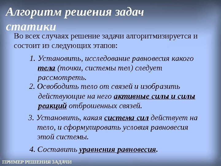 Во всех случаях решение задачи алгоритмизируется и состоит из следующих этапов: 1. Установить, исследование равновесия какого тела (точки, системы тел) следует рассмотреть. 2. Освободить тело от связей и изобразить действующие на него активные силы и силы реакций отброшенных связей. 3. Установить, какая система сил действует на тело, и сформулировать условия равновесия этой системы. 4. Составить уравнения равновесия. Алгоритм решения задач статики ПРИМЕР РЕШЕНИЯ ЗАДАЧИ