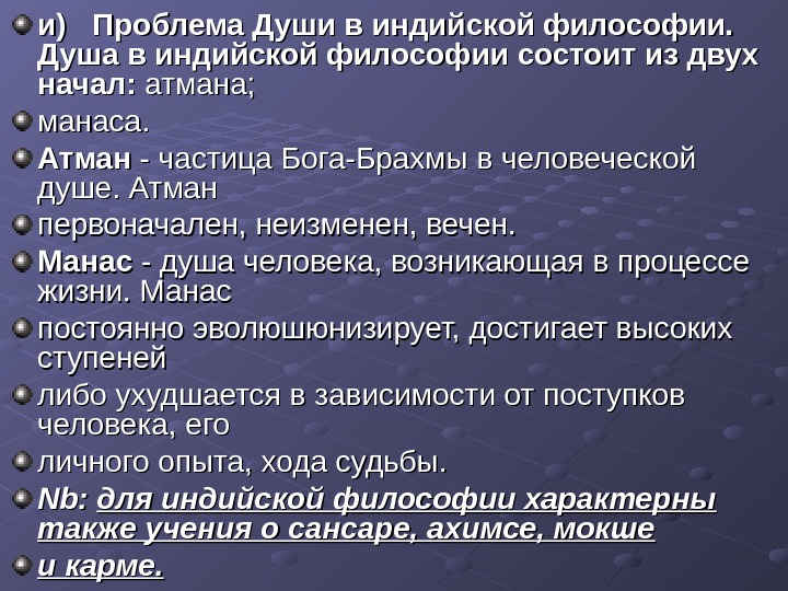 и) Проблема Души в индийской философии. Душа в индийской философии состоит из двух начал: атмана; манаса. Атман — частица Бога-Брахмы в человеческой душе. Атман первоначален, неизменен, вечен. Манас — душа человека, возникающая в процессе жизни. Манас постоянно эволюшюнизирует, достигает высоких ступеней либо ухудшается в зависимости от поступков человека, его личного опыта, хода судьбы. Nb. Nb : : для индийской философии характерны также учения о сансаре, ахимсе, мокше и карме.