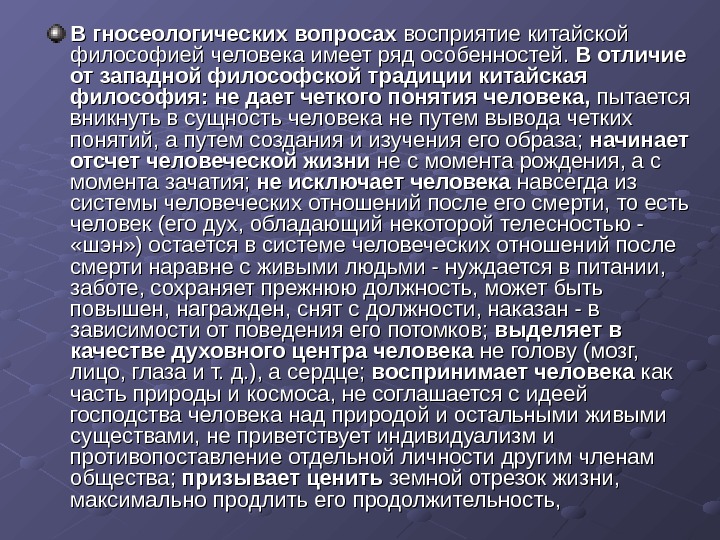 В гносеологических вопросах восприятие китайской философией человека имеет ряд особенностей. В отличие от западной философской традиции китайская философия: не дает четкого понятия человека, пытается вникнуть в сущность человека не путем вывода четких понятий, а путем создания и изучения его образа; начинает отсчет человеческой жизни не с момента рождения, а с момента зачатия; не исключает человека навсегда из системы человеческих отношений после его смерти, то есть человек (его дух, обладающий некоторой телесностью — «шэн» ) остается в системе человеческих отношений после смерти наравне с живыми людьми — нуждается в питании, заботе, сохраняет прежнюю должность, может быть повышен, награжден, снят с должности, наказан — в зависимости от поведения его потомков; выделяет в качестве духовного центра человека не голову (мозг, лицо, глаза и т. д. ), а сердце; воспринимает человека как часть природы и космоса, не соглашается с идеей господства человека над природой и остальными живыми существами, не приветствует индивидуализм и противопоставление отдельной личности другим членам общества; призывает ценить земной отрезок жизни, максимально продлить его продолжительность,
