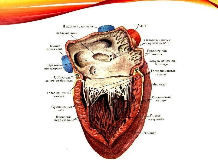 ПРАВОЕ ПРЕДСЕРДИЕ • Собирает венозную кровь со всего тела • Впадают: верхняя и нижняя полые вены • Имеется венечный синус (сбор крови из собственных вен сердца) • На передней стенке имеется выпячивание – правое ушко • На межпредсердной перегородке находится овальная ямка , в области которой у плода расположено отверстие, сообщающее пра вое предсердие с левым и зарастающее после рождения • Кровь из правого предсердия через предсердно-желудочковое отверстие попадает в правый желудочек Верхняя полая вена Нижняя полая вена
