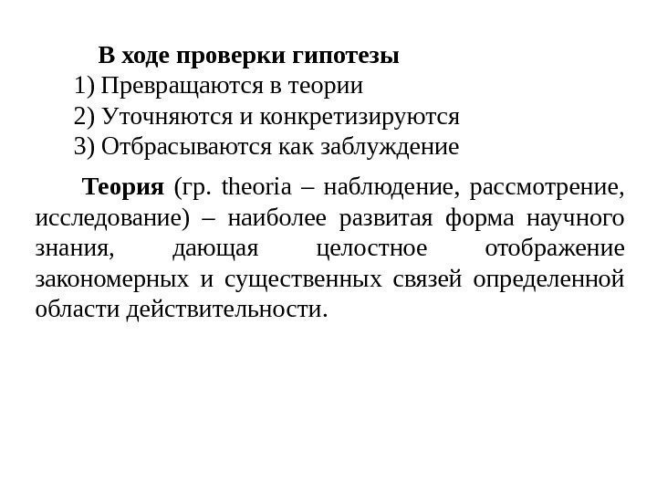 В ходе проверки гипотезы 1) Превращаются в теории 2) Уточняются и конкретизируются 3) Отбрасываются как заблуждение Теория (гр. theoria – наблюдение, рассмотрение, исследование) – наиболее развитая форма научного знания, дающая целостное отображение закономерных и существенных связей определенной области действительности.