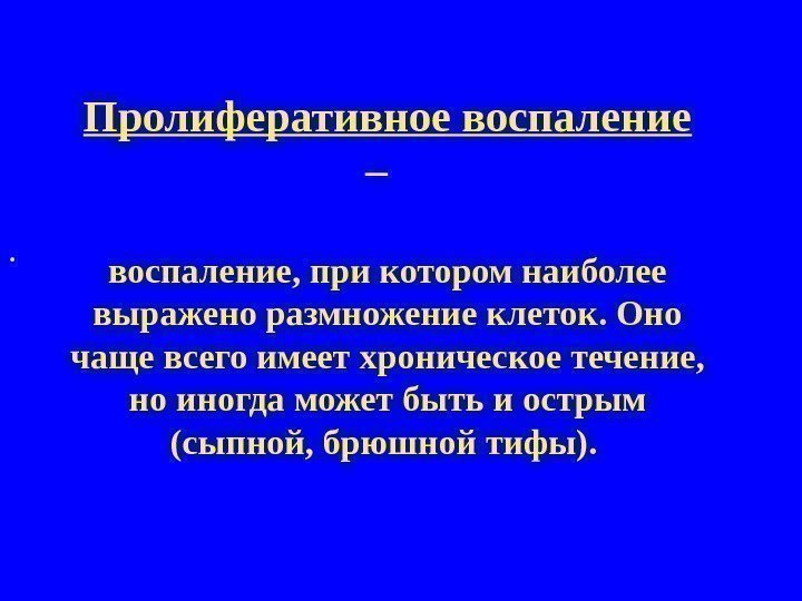 Пролиферативное воспаление – воспаление, при котором наиболее выражено размножение клеток. Оно чаще всего имеет хроническое течение, но иногда может быть и острым (сыпной, брюшной тифы). .