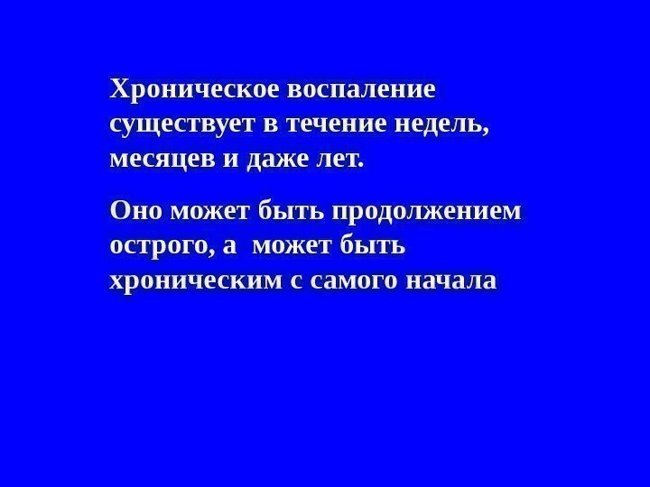 Хроническое воспаление существует в течение недель, месяцев и даже лет. Оно может быть продолжением острого , а может быть хроническим с самого начала