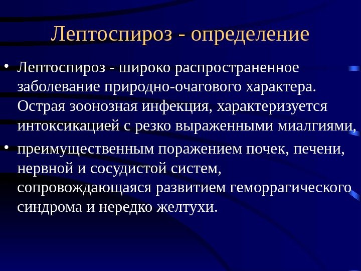 Лептоспироз — определение • Лептоспироз — широко распространенное заболевание природно-очагового характера. Острая зоонозная инфекция, характеризуется интоксикацией с резко выраженными миалгиями, • преимущественным поражением почек, печени, нервной и сосудистой систем, сопровождающаяся развитием геморрагического синдрома и нередко желтухи.