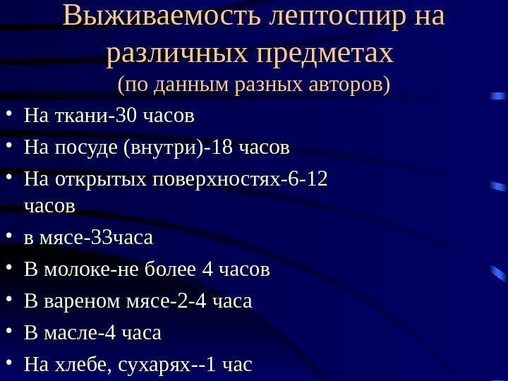 Выживаемость лептоспир на различных предметах (по данным разных авторов) • На ткани-30 часов • На посуде (внутри)-18 часов • На открытых поверхностях-6 -12 часов • в мясе-33 часа • В молоке-не более 4 часов • В вареном мясе-2 -4 часа • В масле-4 часа • На хлебе, сухарях—1 час