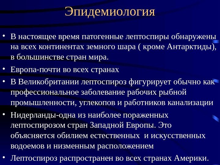 Эпидемиология • В настоящее время патогенные лептоспиры обнаружены на всех континентах земного шара ( кроме Антарктиды), в большинстве стран мира. • Европа-почти во всех странах • В Великобритании лептоспироз фигурирует обычно как профессиональное заболевание рабочих рыбной промышленности, углекопов и работников канализации • Нидерланды-одна из наиболее пораженных лептоспирозом стран Западной Европы. Это объясняется обилием естественных и искусственных водоемов и низменным расположением • Лептоспироз распространен во всех странах Америки.