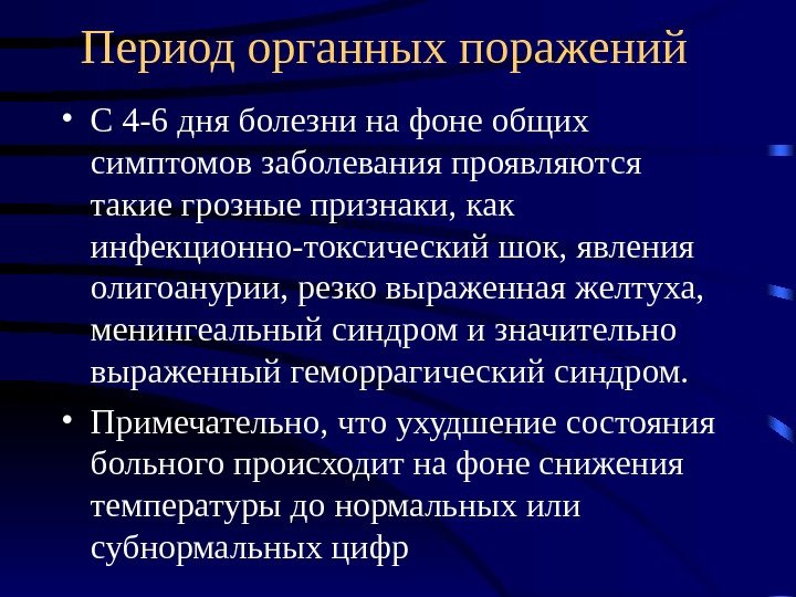 Период органных поражений • С 4 -6 дня болезни на фоне общих симптомов заболевания проявляются такие грозные признаки, как инфекционно-токсический шок, явления олигоанурии, резко выраженная желтуха, менингеальный синдром и значительно выраженный геморрагический синдром. • Примечательно, что ухудшение состояния больного происходит на фоне снижения температуры до нормальных или субнормальных цифр