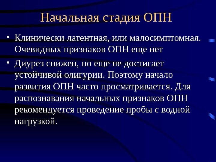 Начальная стадия ОПН • Клинически латентная, или малосимптомная. Очевидных признаков ОПН еще нет • Диурез снижен, но еще не достигает устойчивой олигурии. Поэтому начало развития ОПН часто просматривается. Для распознавания начальных признаков ОПН рекомендуется проведение пробы с водной нагрузкой.