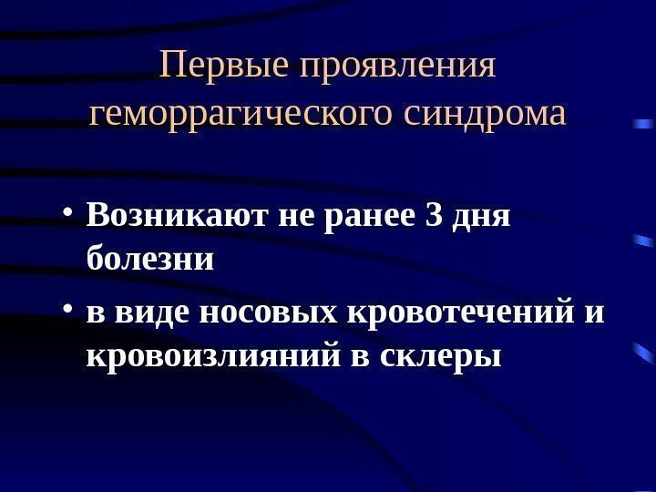 Первые проявления геморрагического синдрома • Возникают не ранее 3 дня болезни • в виде носовых кровотечений и кровоизлияний в склеры