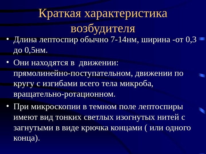 Краткая характеристика возбудителя • Длина лептоспир обычно 7 -14 нм, ширина -от 0, 3 до 0, 5 нм. • Они находятся в движении: прямолинейно-поступательном, движении по кругу с изгибами всего тела микроба, вращательно-ротационном. • При микроскопии в темном поле лептоспиры имеют вид тонких светлых изогнутых нитей с загнутыми в виде крючка концами ( или одного конца).