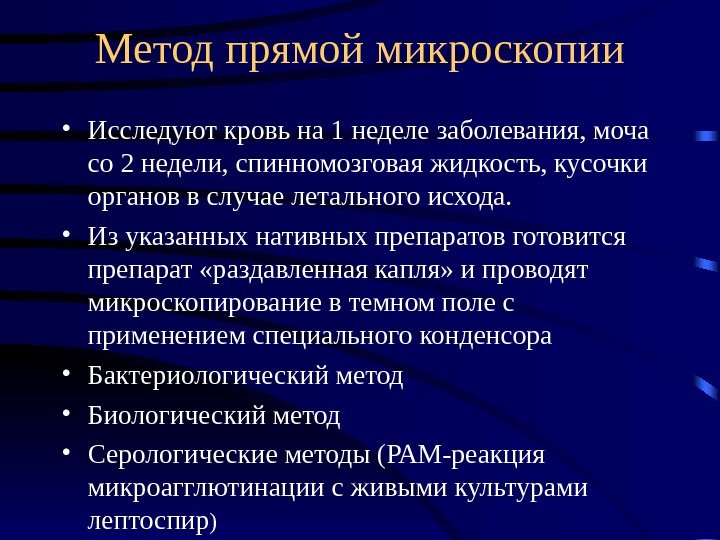 Метод прямой микроскопии • Исследуют кровь на 1 неделе заболевания, моча со 2 недели, спинномозговая жидкость, кусочки органов в случае летального исхода. • Из указанных нативных препаратов готовится препарат «раздавленная капля» и проводят микроскопирование в темном поле с применением специального конденсора • Бактериологический метод • Биологический метод • Серологические методы (РАМ-реакция микроагглютинации с живыми культурами лептоспир )