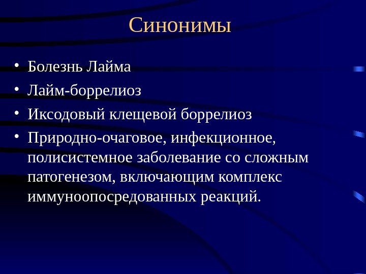 Синонимы • Болезнь Лайма • Лайм-боррелиоз • Иксодовый клещевой боррелиоз • Природно-очаговое, инфекционное, полисистемное заболевание со сложным патогенезом, включающим комплекс иммуноопосредованных реакций.
