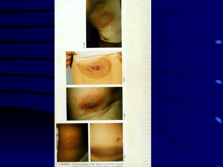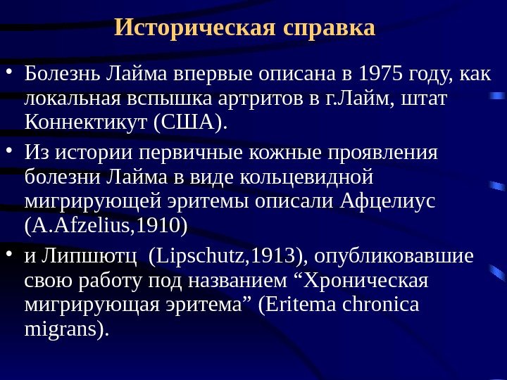 Историческая справка • Болезнь Лайма впервые описана в 1975 году, как локальная вспышка артритов в г. Лайм, штат Коннектикут (США). • Из истории первичные кожные проявления болезни Лайма в виде кольцевидной мигрирующей эритемы описали Афцелиус (A. Afzelius, 1910) • и Липшютц (Lipschutz, 1913), опубликовавшие свою работу под названием “Хроническая мигрирующая эритема” (Eritema chronica migrans).