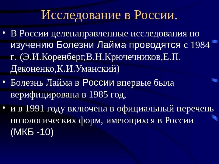 Исследование в России. • В России целенаправленные исследования по изучению Болезни Лайма проводятся с 1984 г. (Э. И. Коренберг, В. Н. Крючечников, Е. П. Деконенко, К. И. Уманский) • Болезнь Лайма в России впервые была верифицирована в 1985 год, • и в 1991 году включена в официальный перечень нозологических форм, имеющихся в России (МКБ -10)