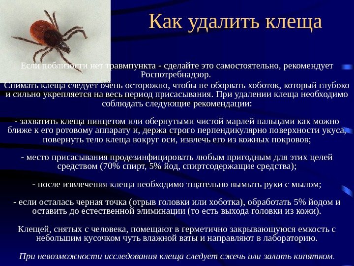 Как удалить клеща Если поблизости нет травмпункта — сделайте это самостоятельно, рекомендует Роспотребнадзор. Снимать клеща следует очень осторожно, чтобы не оборвать хоботок, который глубоко и сильно укрепляется на весь период присасывания. При удалении клеща необходимо соблюдать следующие рекомендации: — захватить клеща пинцетом или обернутыми чистой марлей пальцами как можно ближе к его ротовому аппарату и, держа строго перпендикулярно поверхности укуса, повернуть тело клеща вокруг оси, извлечь его из кожных покровов; — место присасывания продезинфицировать любым пригодным для этих целей средством (70% спирт, 5% йод, спиртсодержащие средства); — после извлечения клеща необходимо тщательно вымыть руки с мылом; — если осталась черная точка (отрыв головки или хоботка), обработать 5% йодом и оставить до естественной элиминации (то есть выхода головки из кожи). Клещей, снятых с человека, помещают в герметично закрывающуюся емкость с небольшим кусочком чуть влажной ваты и направляют в лабораторию. При невозможности исследования клеща следует сжечь или залить кипятком.