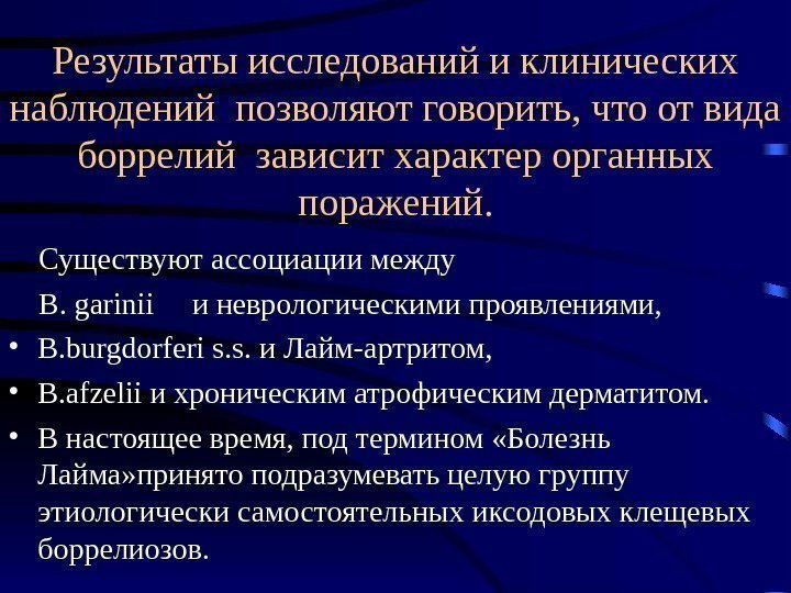 Результаты исследований и клинических наблюдений позволяют говорить, что от вида боррелий зависит характер органных поражений. Существуют ассоциации между В. garinii и неврологическими проявлениями, • В. burgdorferi s. s. и Лайм-артритом, • В. afzelii и хроническим атрофическим дерматитом. • В настоящее время, под термином «Болезнь Лайма» принято подразумевать целую группу этиологически самостоятельных иксодовых клещевых боррелиозов.