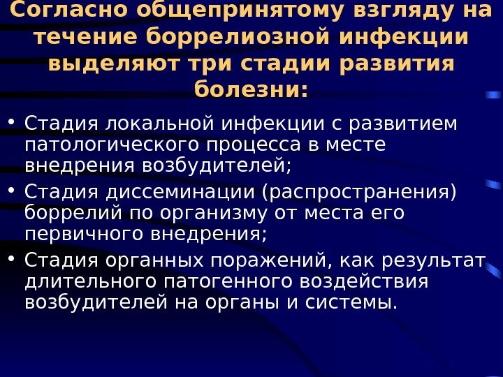 Согласно общепринятому взгляду на течение боррелиозной инфекции выделяют три стадии развития болезни: • Стадия локальной инфекции с развитием патологического процесса в месте внедрения возбудителей; • Стадия диссеминации (распространения) боррелий по организму от места его первичного внедрения; • Стадия органных поражений, как результат длительного патогенного воздействия возбудителей на органы и системы.