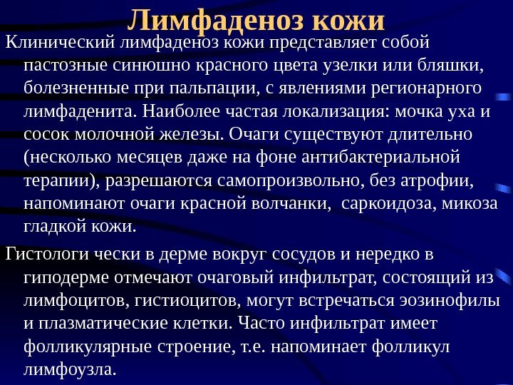 Лимфаденоз кожи Клинический лимфаденоз кожи представляет собой пастозные синюшно красного цвета узелки или бляшки, болезненные при пальпации, с явлениями регионарного лимфаденита. Наиболее частая локализация: мочка уха и сосок молочной железы. Очаги существуют длительно (несколько месяцев даже на фоне антибактериальной терапии), разрешаются самопроизвольно, без атрофии, напоминают очаги красной волчанки, саркоидоза, микоза гладкой кожи. Гистологи чески в дерме вокруг сосудов и нередко в гиподерме отмечают очаговый инфильтрат, состоящий из лимфоцитов, гистиоцитов, могут встречаться эозинофилы и плазматические клетки. Часто инфильтрат имеет фолликулярные строение, т. е. напоминает фолликул лимфоузла.