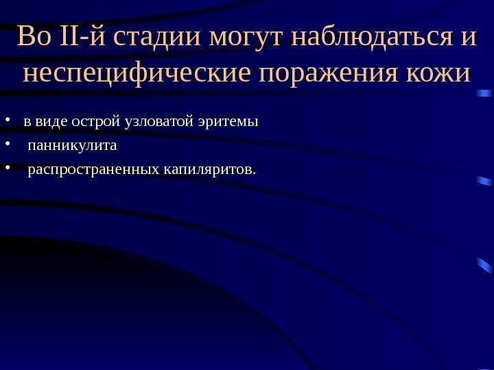 Во II-й стадии могут наблюдаться и неспецифические поражения кожи • в виде острой узловатой эритемы • панникулита • распространенных капиляритов.