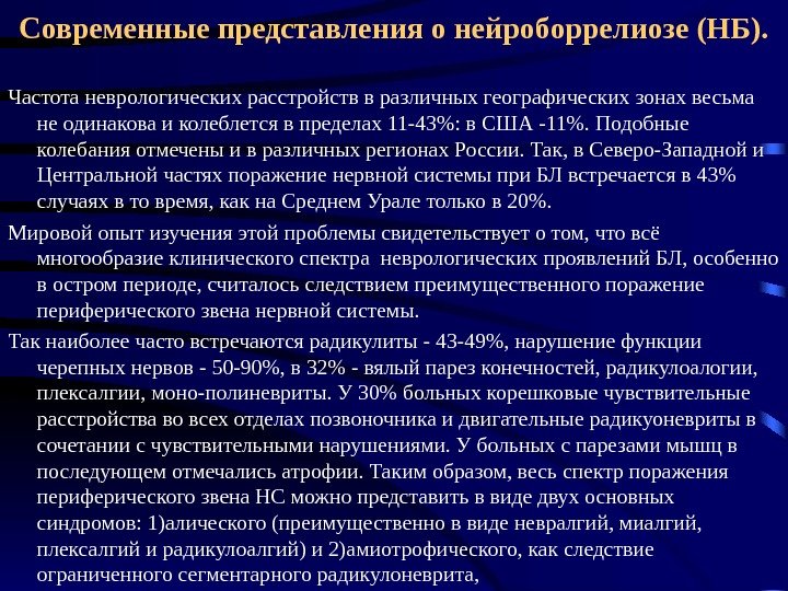 Современные представления о нейроборрелиозе (НБ). Частота неврологических расстройств в различных географических зонах весьма не одинакова и колеблется в пределах 11 -43%: в США -11%. Подобные колебания отмечены и в различных регионах России. Так, в Северо-Западной и Центральной частях поражение нервной системы при БЛ встречается в 43% случаях в то время, как на Среднем Урале только в 20%. Мировой опыт изучения этой проблемы свидетельствует о том, что всё многообразие клинического спектра неврологических проявлений БЛ, особенно в остром периоде, считалось следствием преимущественного поражение периферического звена нервной системы. Так наиболее часто встречаются радикулиты — 43 -49%, нарушение функции черепных нервов — 50 -90%, в 32% — вялый парез конечностей, радикулоалогии, плексалгии, моно-полиневриты. У 30% больных корешковые чувствительные расстройства во всех отделах позвоночника и двигательные радикуоневриты в сочетании с чувствительными нарушениями. У больных с парезами мышц в последующем отмечались атрофии. Таким образом, весь спектр поражения периферического звена НС можно представить в виде двух основных синдромов: 1)алического (преимущественно в виде невралгий, миалгий, плексалгий и радикулоалгий) и 2)амиотрофического, как следствие ограниченного сегментарного радикулоневрита,